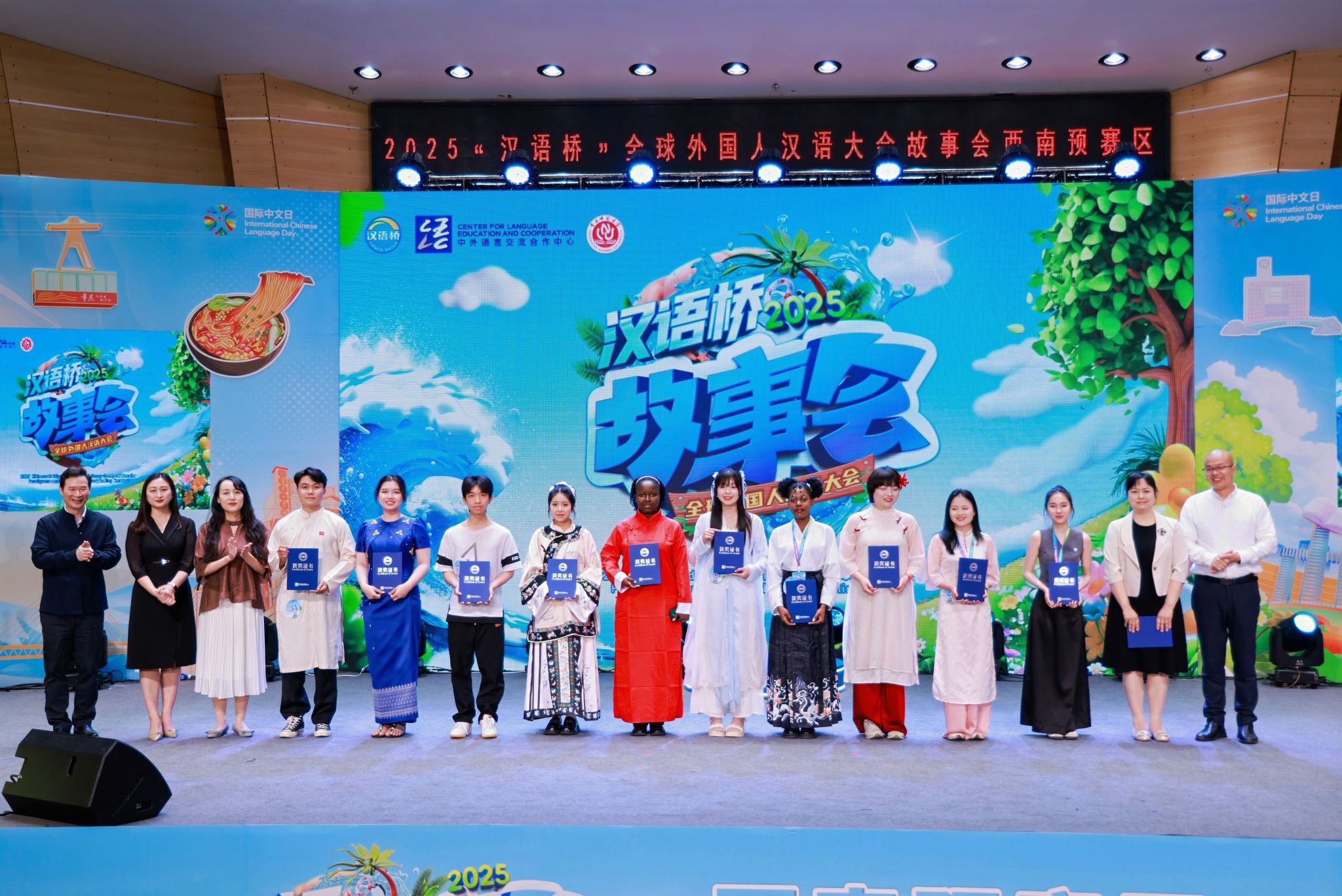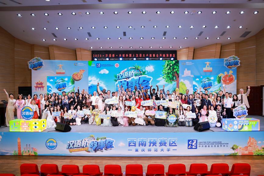 4月20日,正值国际中文日,2025“汉语桥”全球外国人汉语大会——故事会西南赛区预赛在重庆师范大学员工会堂音乐厅精彩开赛。来自云、贵、川、渝四省市的180余名外国中文爱好者齐聚一堂,用生动的语言和精彩的表现讲述中国故事,展现多元文化魅力。学院24名来自不同国家的职工积极参与此次比赛,并取得优异成绩。