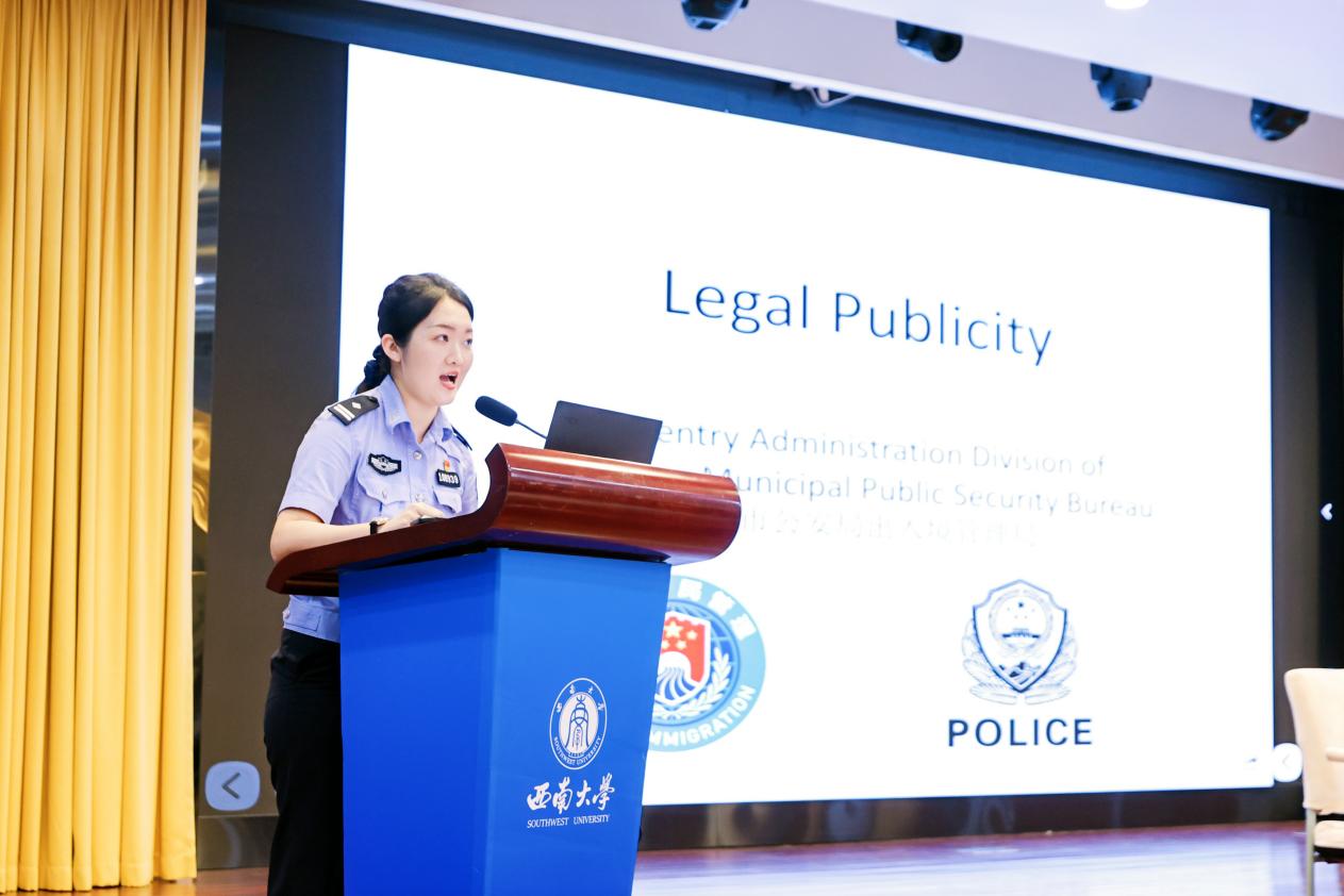 为帮助2025级国际员工新生更好了解中国相关法律法规及签证政策,顺利开启在华学习生活,2025年9月12日,学院特邀重庆市公安局出入境管理局境外人员管理支队领馆大队舒林大队长一行来校,为全体新生举办了专场法律法规宣讲会,并进行现场签证面签工作。