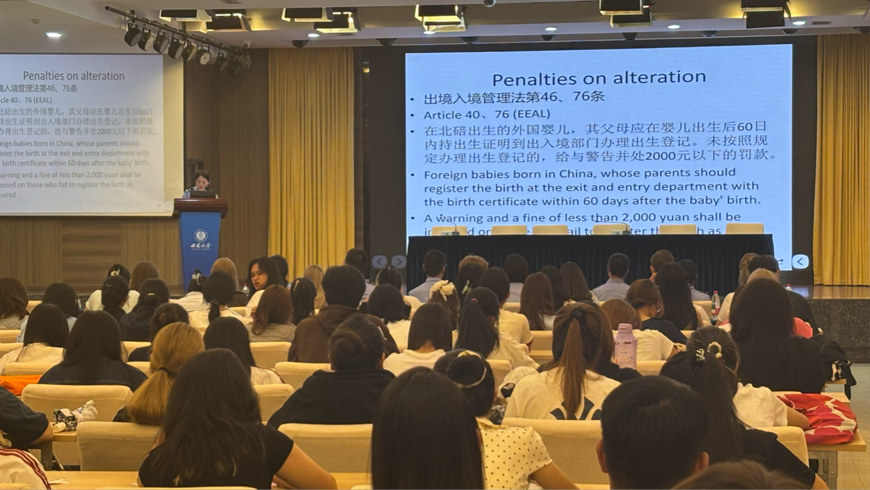 会议开始,警官以真实案例为切入点,围绕签证办理注意事项、外国人来华法律法规、非法就业问题及住宿登记要求等重点内容,为全体来华留学新生作详尽讲解,清晰梳理签证办理的规范流程与常见难点,为大家顺利进入学习生活提供了实用指导。