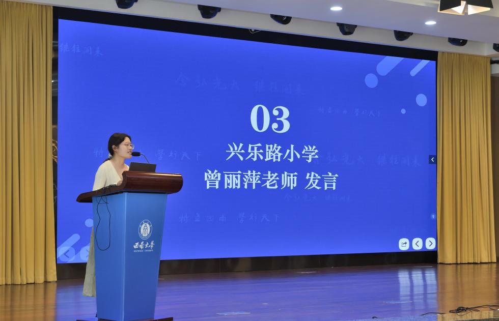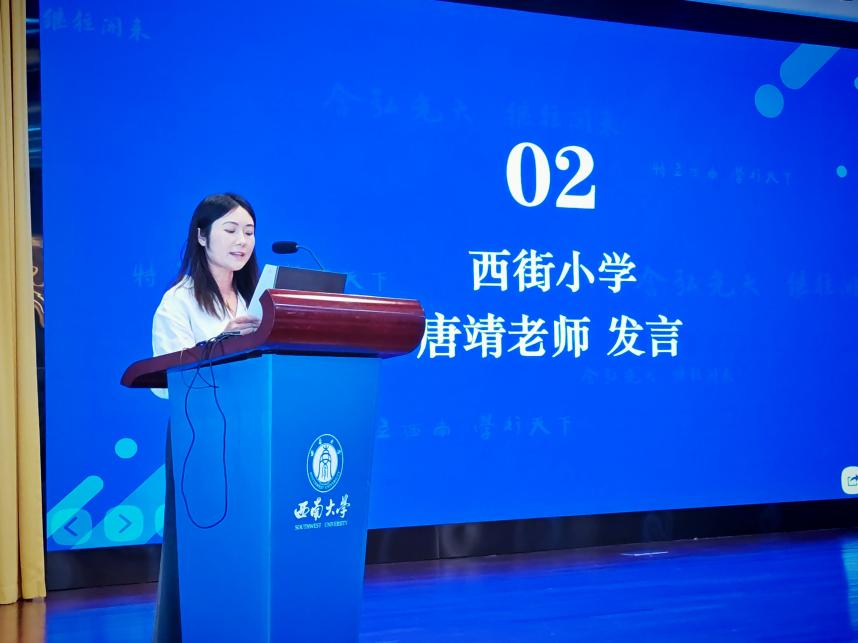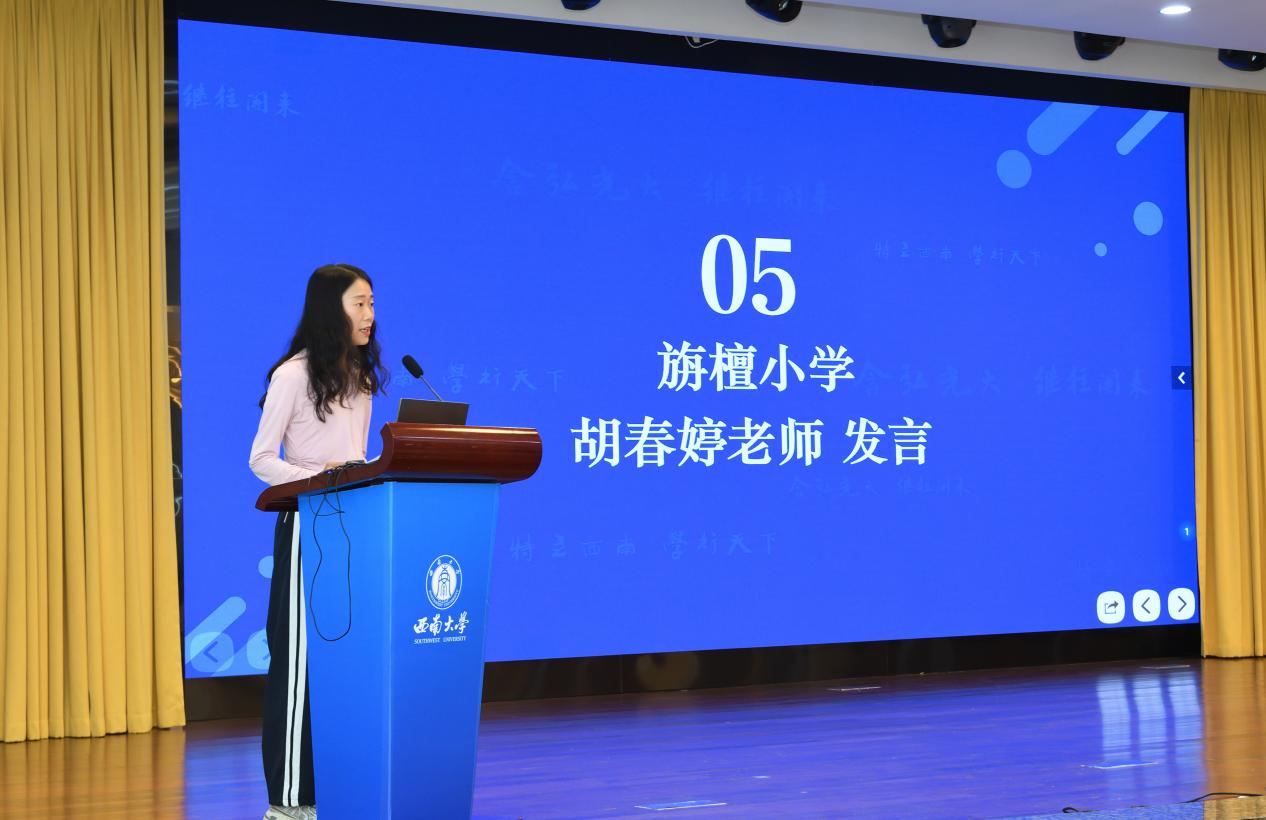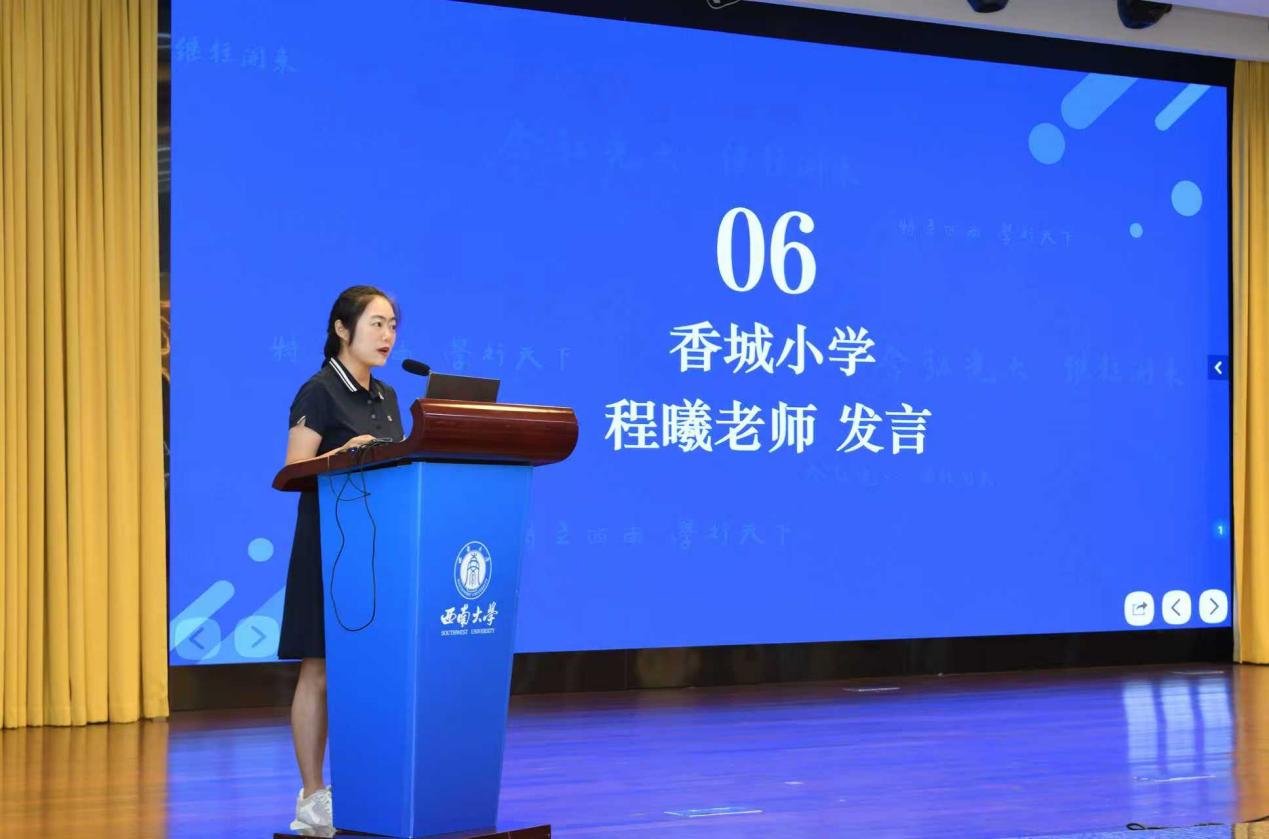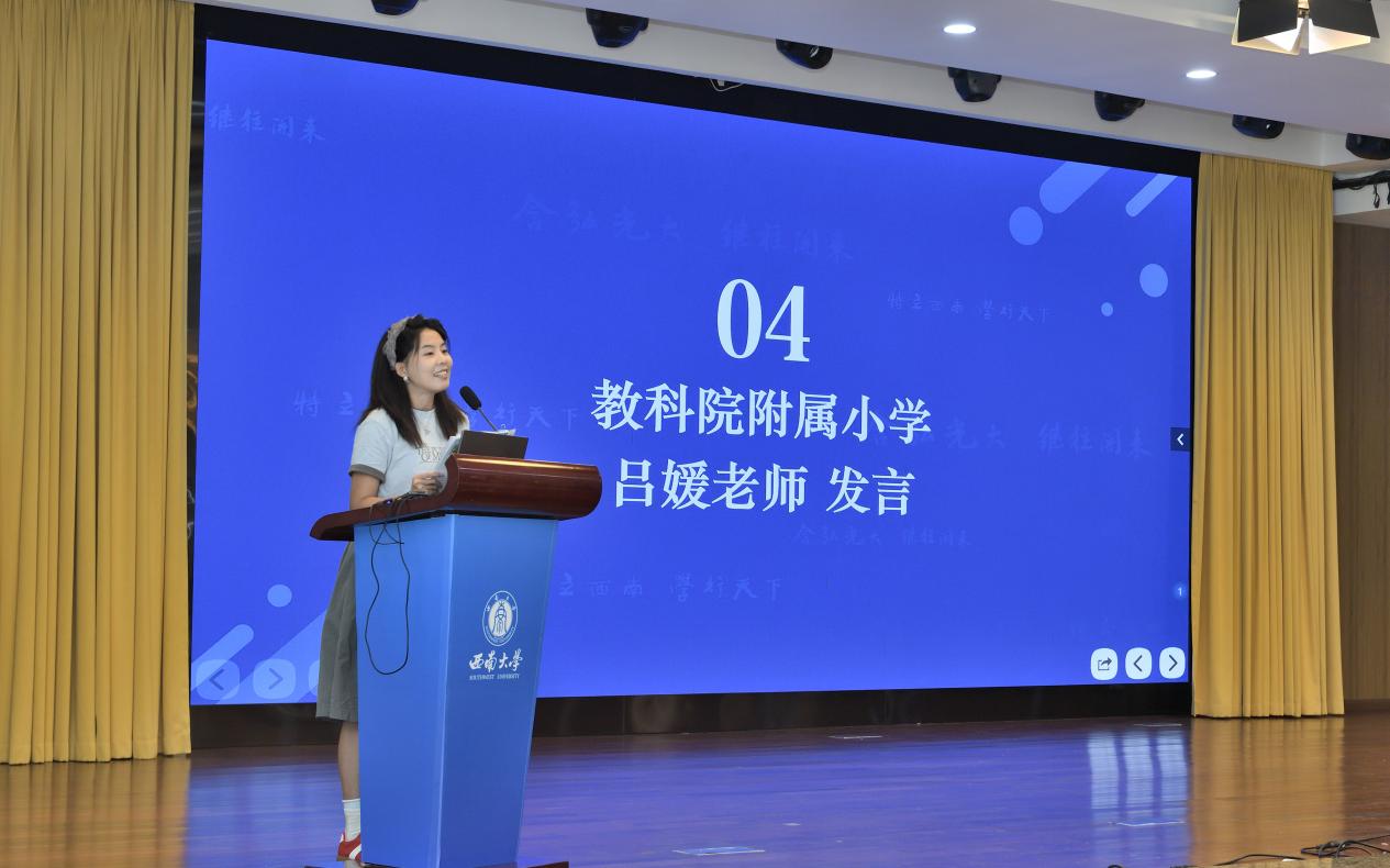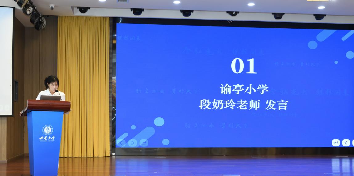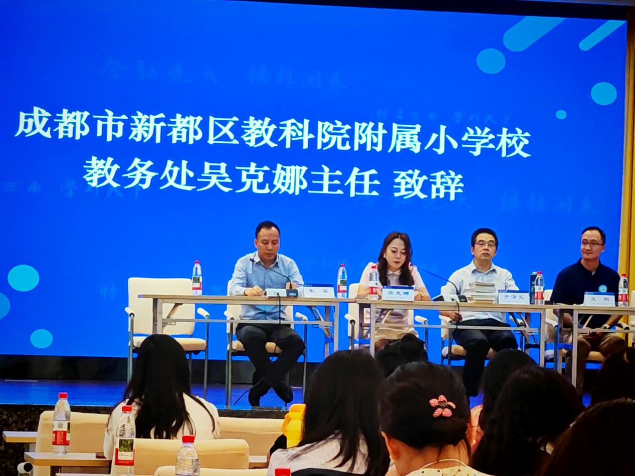 教科院附属小学校教务处吴克娜主任作为学员代表发言。她表示:"我们怀着对教育事业的赤诚之心而来,带着对专业成长的渴望之情而学。全体学员将以空杯心态投入学习,积极参与各项研修活动,力求在理论素养和实践能力上获得全面提升,将先进的教育理念和教学方法带回新都,惠及更多学子。"