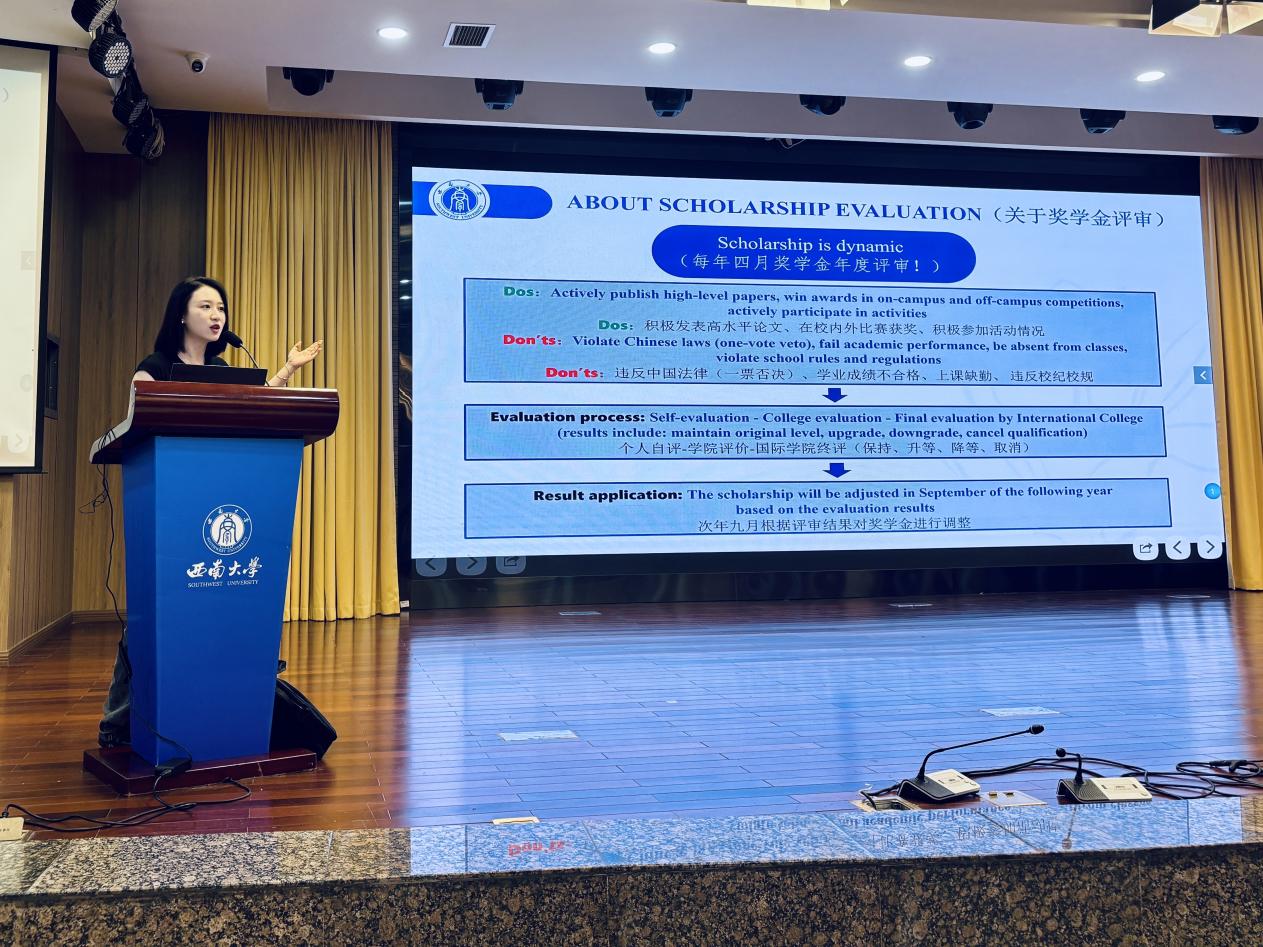 辅导员仇淼老师聚焦奖学金动态管理制度,对奖学金年度评审要求展开说明。她还介绍了来华职工保险制度,详细说明保险适用情形与不适用情形,讲解理赔标准及报销流程,帮助新生掌握保险相关操作要点。