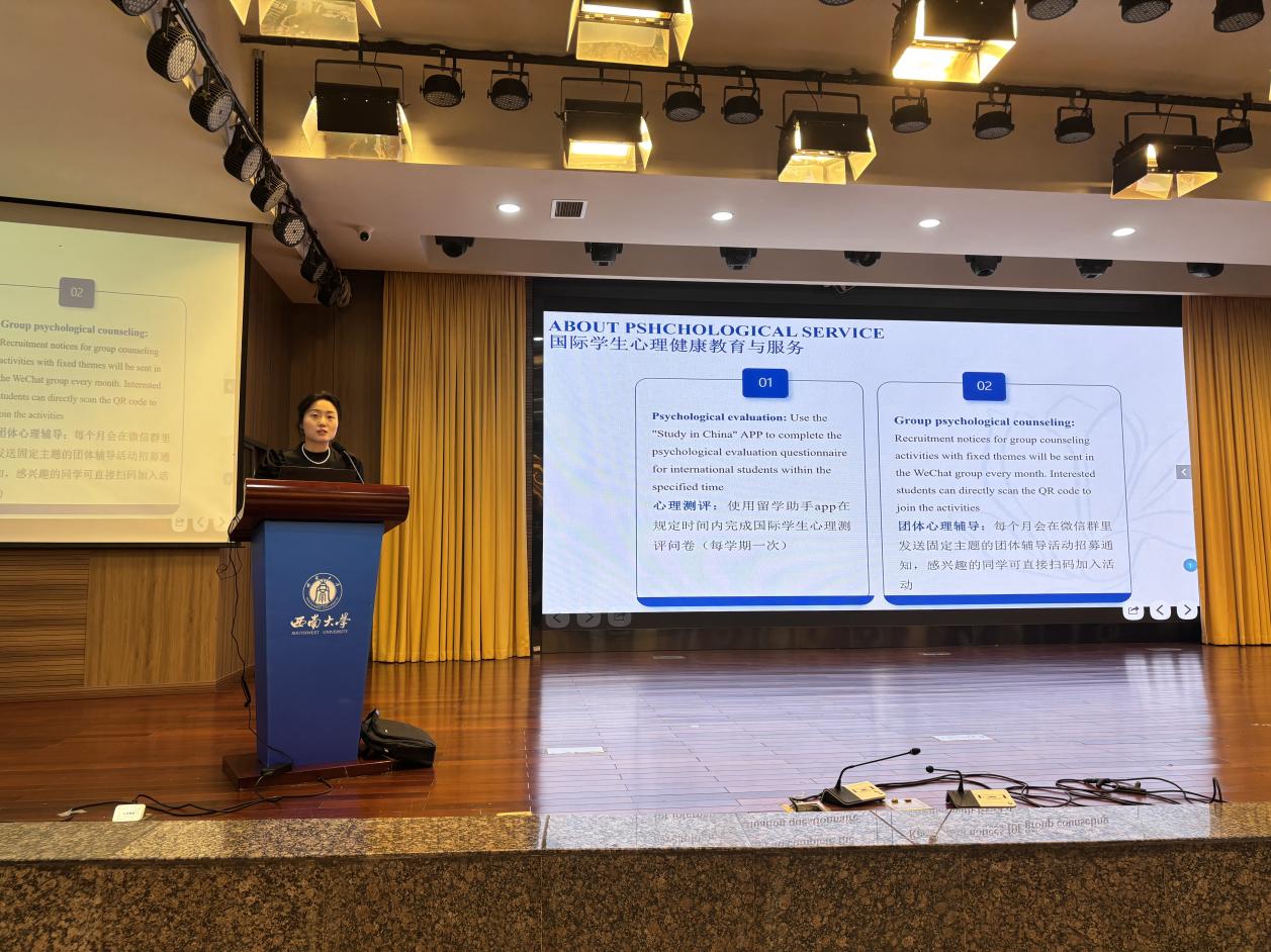 辅导员景柯沥老师详细介绍国际员工的心理健康服务和形式多样的主题心理团辅活动;同时着重讲解国际员工请销假制度,确保新生明晰请假流程与要求。