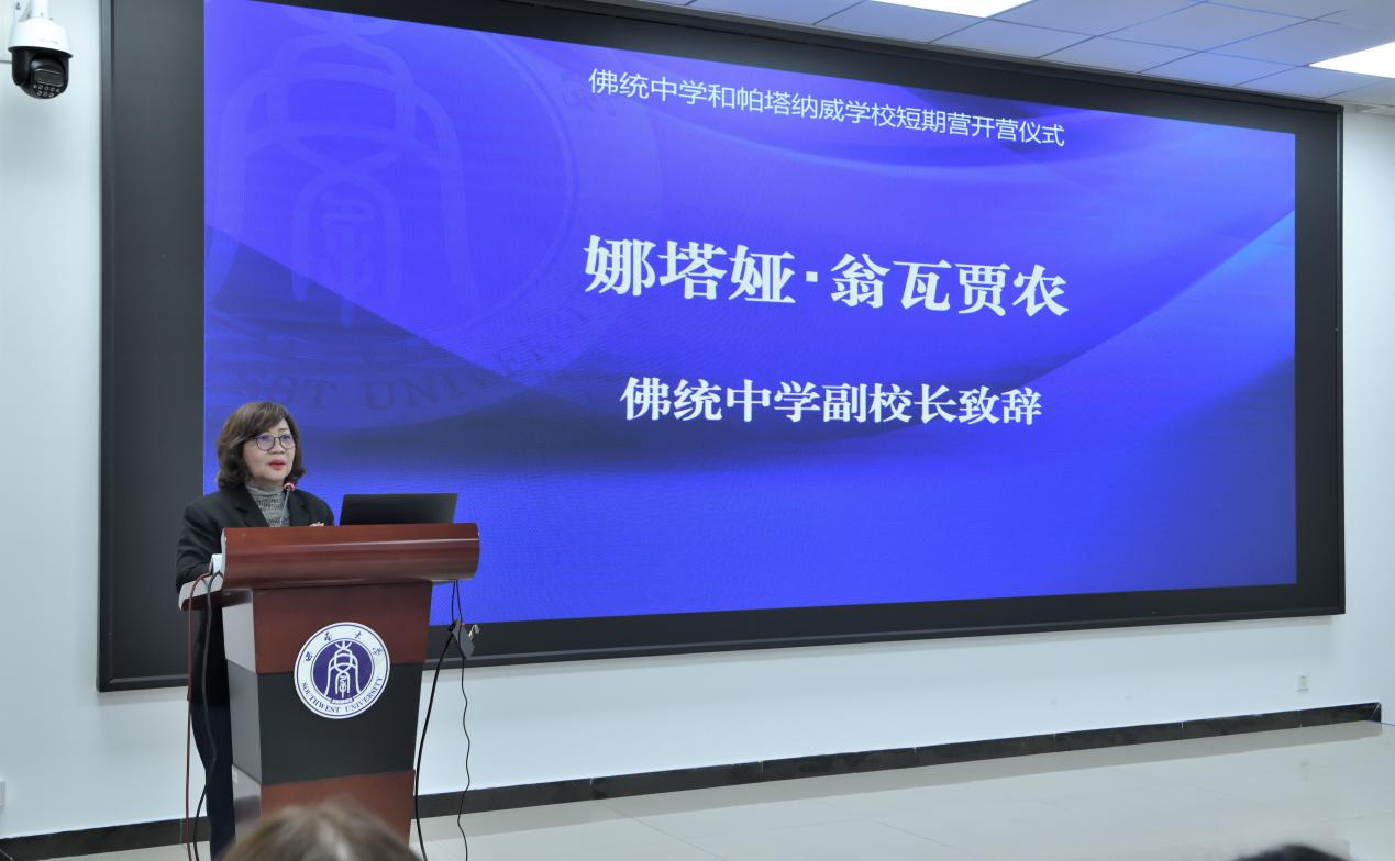 随后,佛统中学副董事长娜塔娅・翁瓦贾上台致辞。她对学员们表达了深切的期许与祝福,希望同学们能够珍惜这次难得的交流机会,深入感受汉语与中华文化的独特魅力,并在学习体验中实现自我成长与提升。