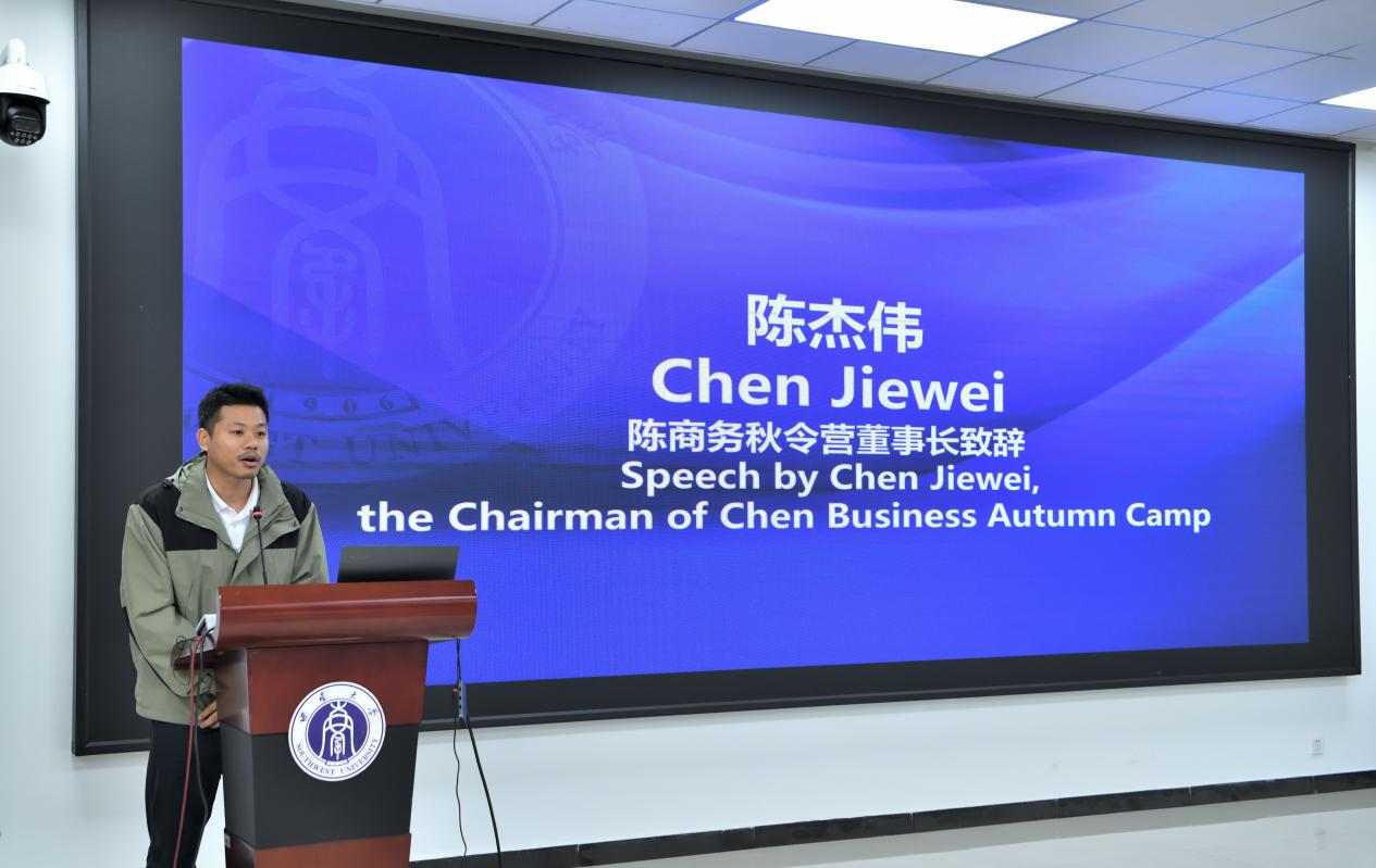 陈商务秋令营董事长陈杰伟发言。他介绍了陈商务秋令营的办学特色与往期成果,鼓励学员们珍惜学习机会,在活动中收获知识与友谊。