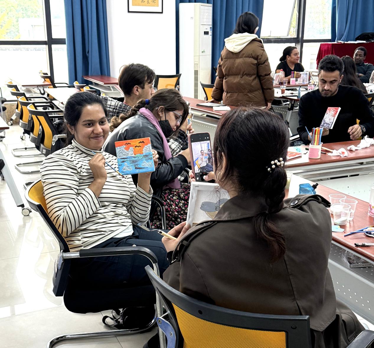 以砂为桥,以画为语。画中见自己,语中见天地。随着主持人的引导,同学们纷纷带着自己的作品开启创作故事的分享之旅,轻松的笑声很快萦绕现场。对讲述者而言,需聚焦外化感受与深度表达——分享砂画创作过程中最强烈的情绪波动及身体反应,从“为何选择绘画大海”到“小鸟意象背后的期待”,在安全的心理距离内触碰自身深层情感体验,让内心想法随创作故事自然流露;对倾听者,则强调共情联结与边界尊重——全程避免主观评价或过度干预,以专注的眼神、轻声的回应传递理解,在不越界的前提下,于他人的文化背景与情感表达中找到自我共鸣,实现跨文化语境下的心灵互通。在主持人清晰的引导下,同学们纷纷主动敞开心扉,分享创作缘由与背后故事,真挚的交流引发阵阵共鸣,现场不时响起轻松的笑声,温暖的互动氛围在彼此的倾诉与倾听中愈发浓厚。