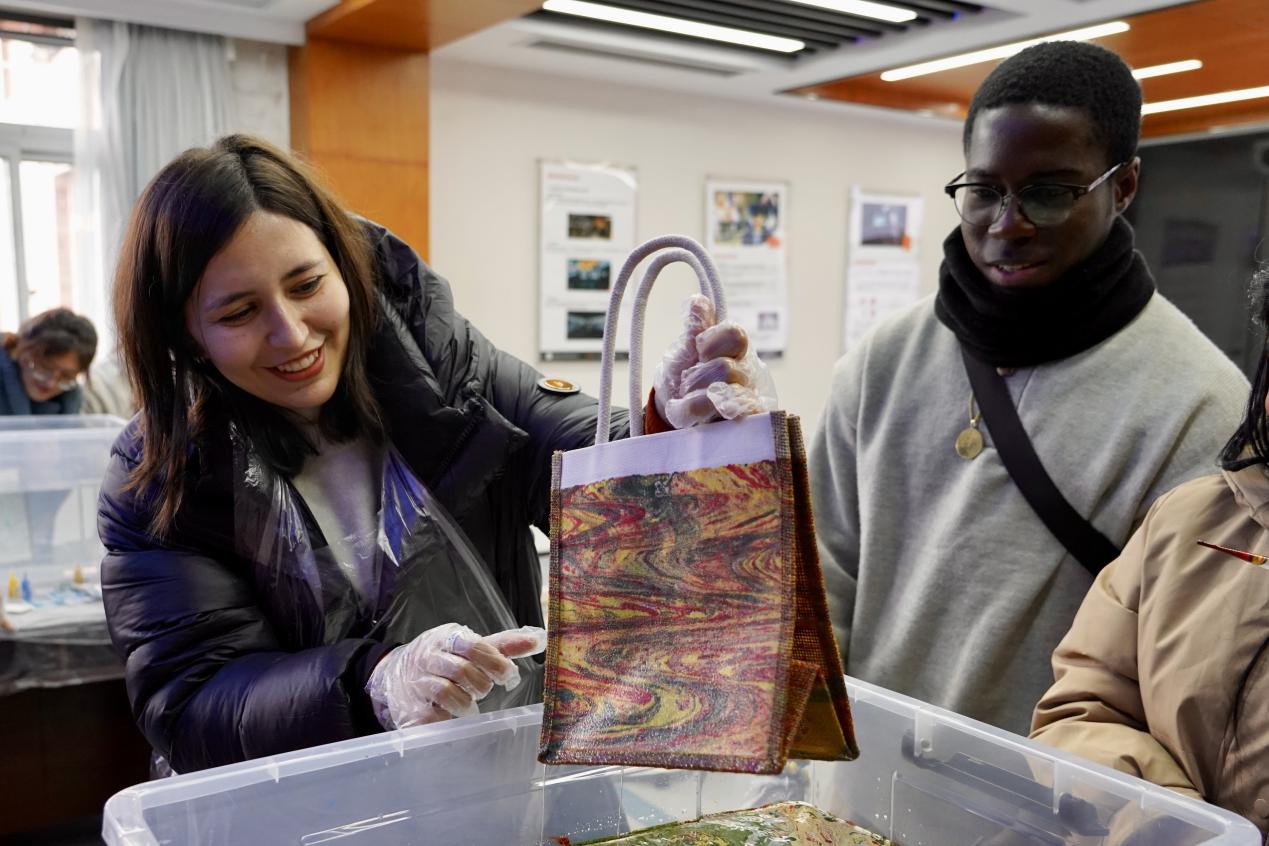仪式结束后,全体人员在实训楼前合影留念。随后,国际员工们分为两组,分别体验了独具特色的非遗文化项目:在茶艺实训室,同学们学习宋代点茶技艺,亲手击拂茶汤、绘制茶沫图案;在工艺体验区,大家尝试传统漂漆扇制作,感受大漆艺术流动变幻之美。不同项目的沉浸式体验,让各国学子在动手实践中加深了对中华文化的理解与情感共鸣。