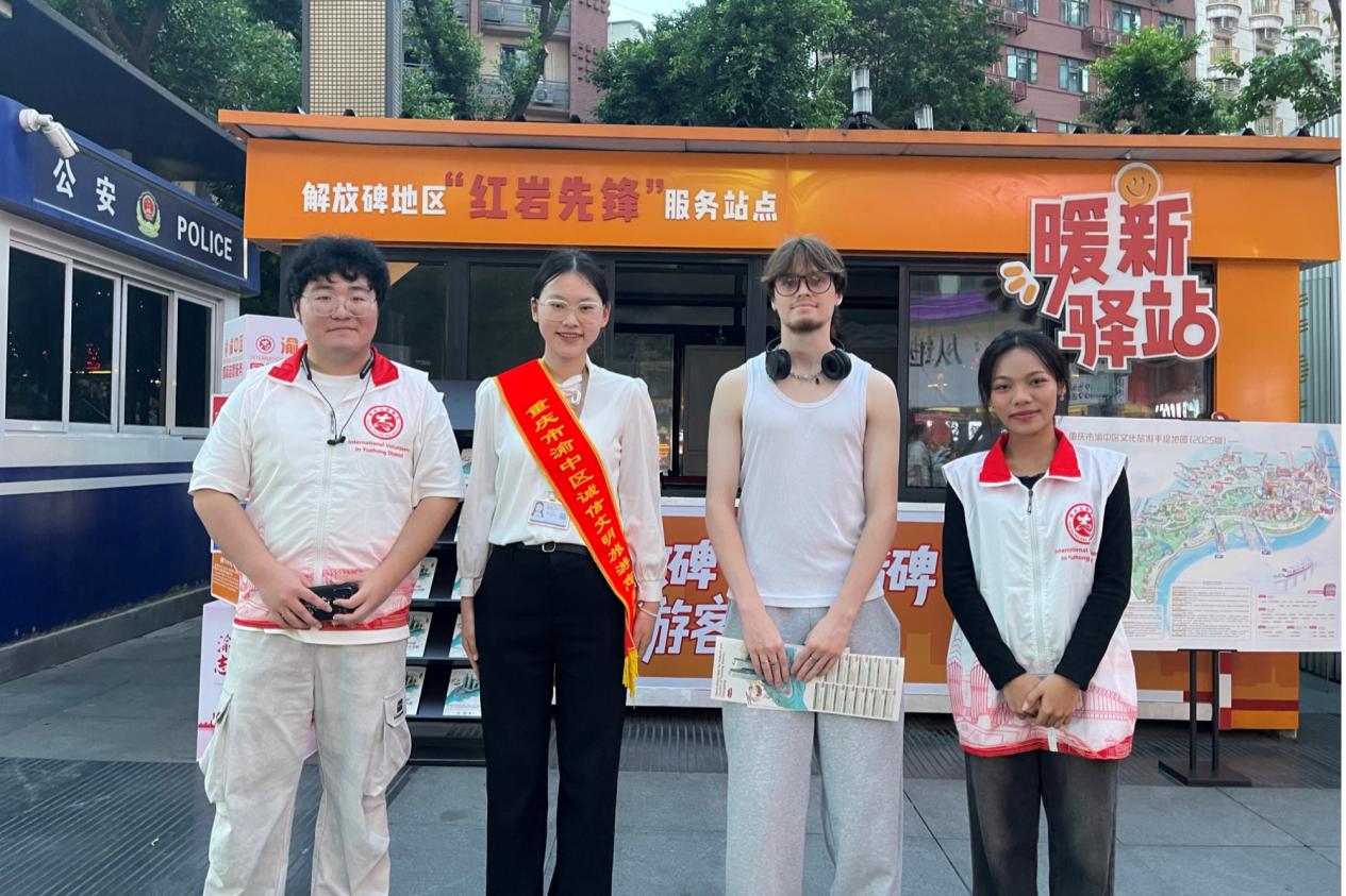 李芳芳和张蕙敏向记者分享了她们在志愿服务中的真实经历与感受。张蕙敏回忆起在国泰广场帮助两位印尼游客的经历时说道:“她们不会说中文,英语也不太好。我拿出地图耐心指引,最终帮助她们步行到达近在咫尺的解放碑。”李芳芳则生动描述了在十八梯服务的暖心时刻:“临走前听到小女孩用泰语说出的‘谢谢’,暖流瞬间消解了乡愁。”