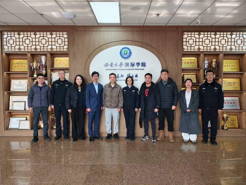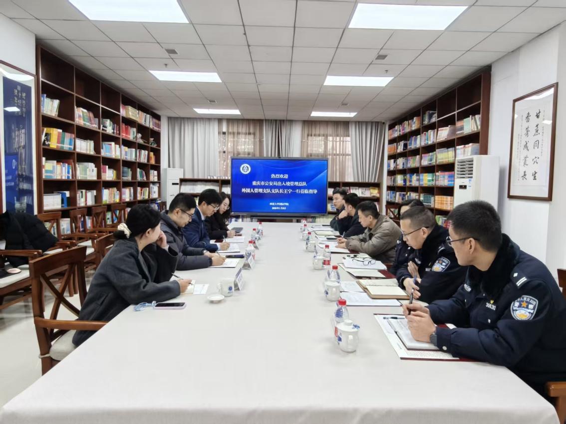 2026年1月8日,重庆市公安局出入境管理总队外国人管理支队支队长王宁、副支队长王戈扬一行,携北碚区公安分局出入境支队支队长周芦飞等人员莅临学院,就职工管理工作开展专题调研。学院副处级干部李林泽及相关员工工作干部参会。