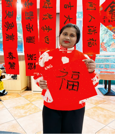在学校精心筹备的留校员工新春团拜会上,李百合沉浸式感受着中国年俗的独特魅力。她亲手包起了饺子,模样虽有些笨拙,却满是由衷的喜悦;首次体验投壶的乐趣,提笔写下人生中第一个“福”字,还收到了学校暖心赠送的压岁红包,真切体会到校园如家一般的温暖与关怀。