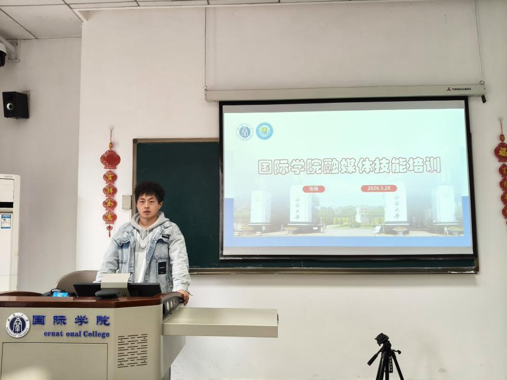 张博结合自身实践经验,围绕拍摄技巧、视频剪辑、海报设计及排版美工等内容展开讲解。他系统介绍了不同场景下的拍摄要点与流程,演示了视频剪辑的基础操作与常见问题处理,并分享了海报设计思路及秀米等工具的排版布局方法。通过生动的案例与现场演示,帮助同学们快速掌握融媒体实操要点,有效提升了内容创作与传播能力。