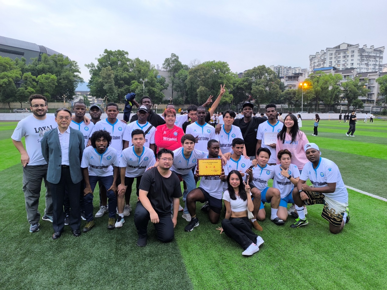 颁奖仪式在学校第三运动场隆重举行,赛事主办方向学校国际员工足球队颁发奖杯。球队苏丹籍国际员工MOHAMMED HASSAN ALI ALAGHIB(中文名:丁子家),以4粒进球荣获联赛(乙组)“金靴奖”。