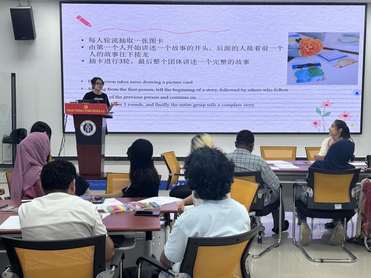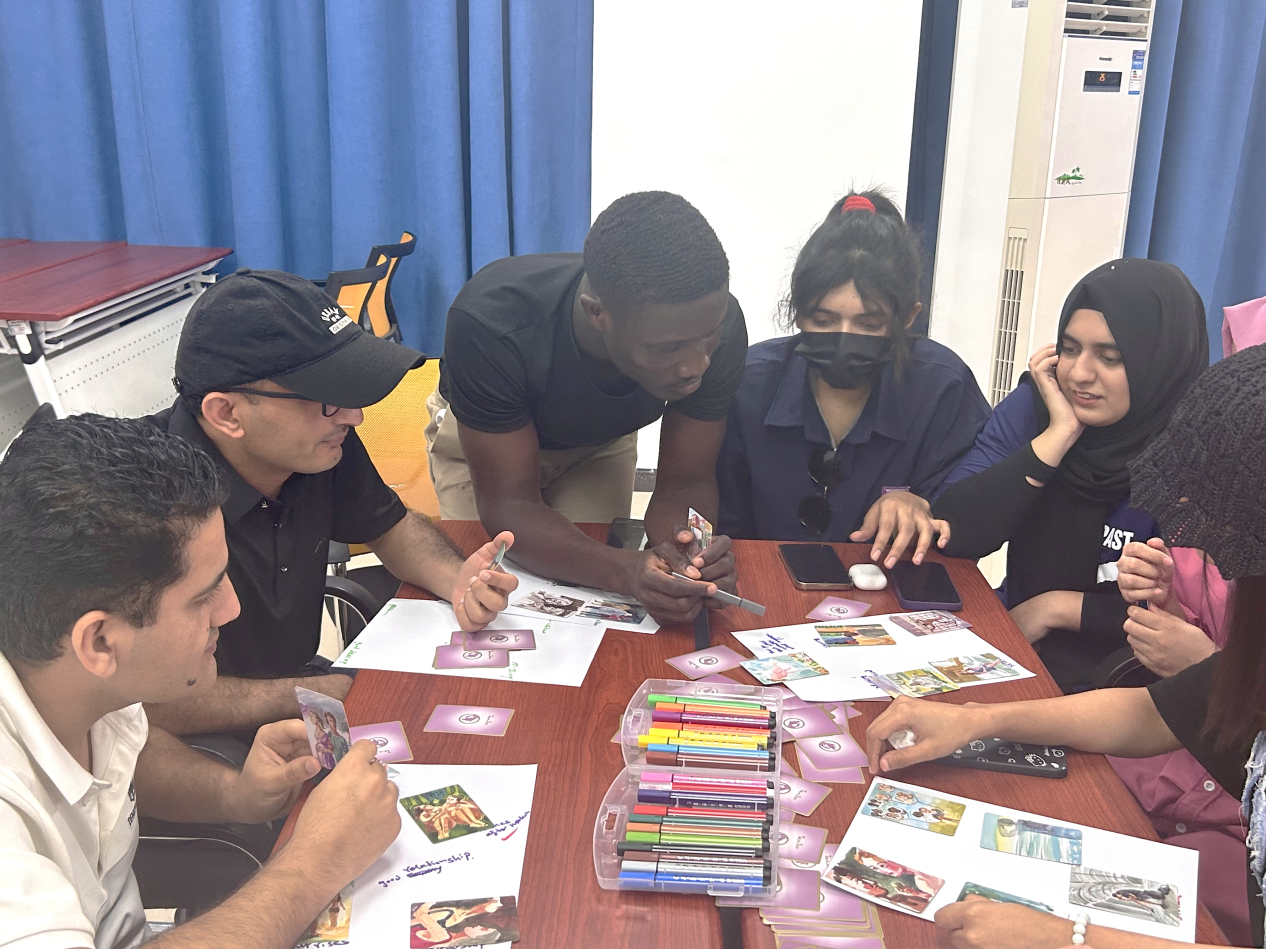 在社交活动多元化的今天,恋爱不再是中外青年的必选项,但与他人建立联系、进行深度交流并互相陪伴依然是必需品。“恋爱故事接力”这一环节便是为了帮助成员打破交友圈结界、学会深度沟通,成员们轮流抽取一张图卡,由第一个人开始创编故事,后面的人依次接力讲故事,直至形成一个完整的故事。成员们充分发挥想象力,通过接龙的方式,为故事增添独特的个人色彩,在表达自我的同时打开了自己、融入了新环境。