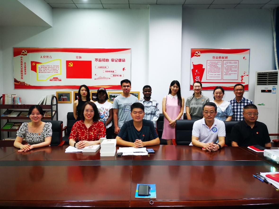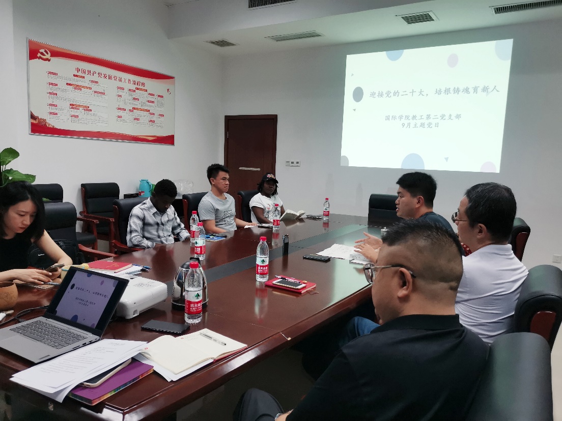 9月19日下午,教工第二党支部在学院304会议室召开“迎接党的二十大 培根筑魂育新人”主题党日活动,来自刚果布、印度尼西亚、喀麦隆的三名职工受邀分享对缙云山扑火感人事迹的心得体会。