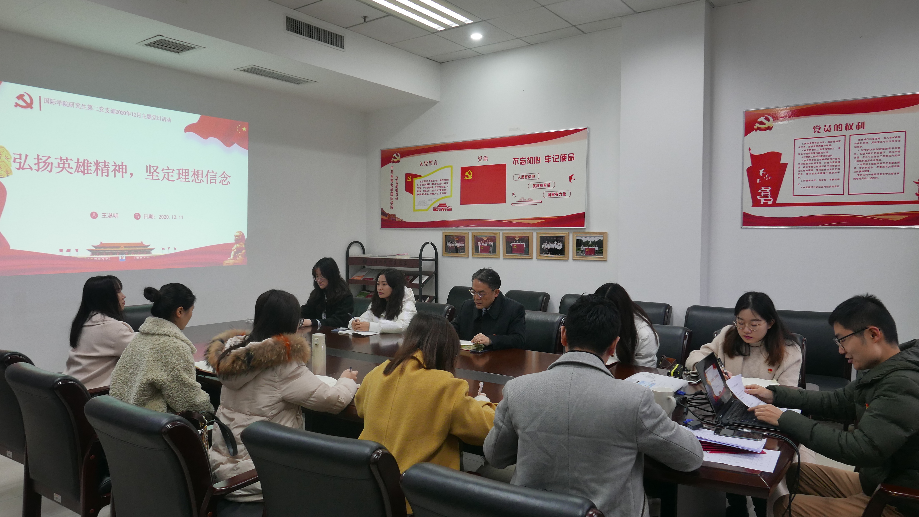 20201211日下午2:30,研究生第三支部全体成员在紫云楼214教室开展以“弘扬英雄精神,坚定理想信念”为主题的党日活动,刘承宇经理莅临指导。
