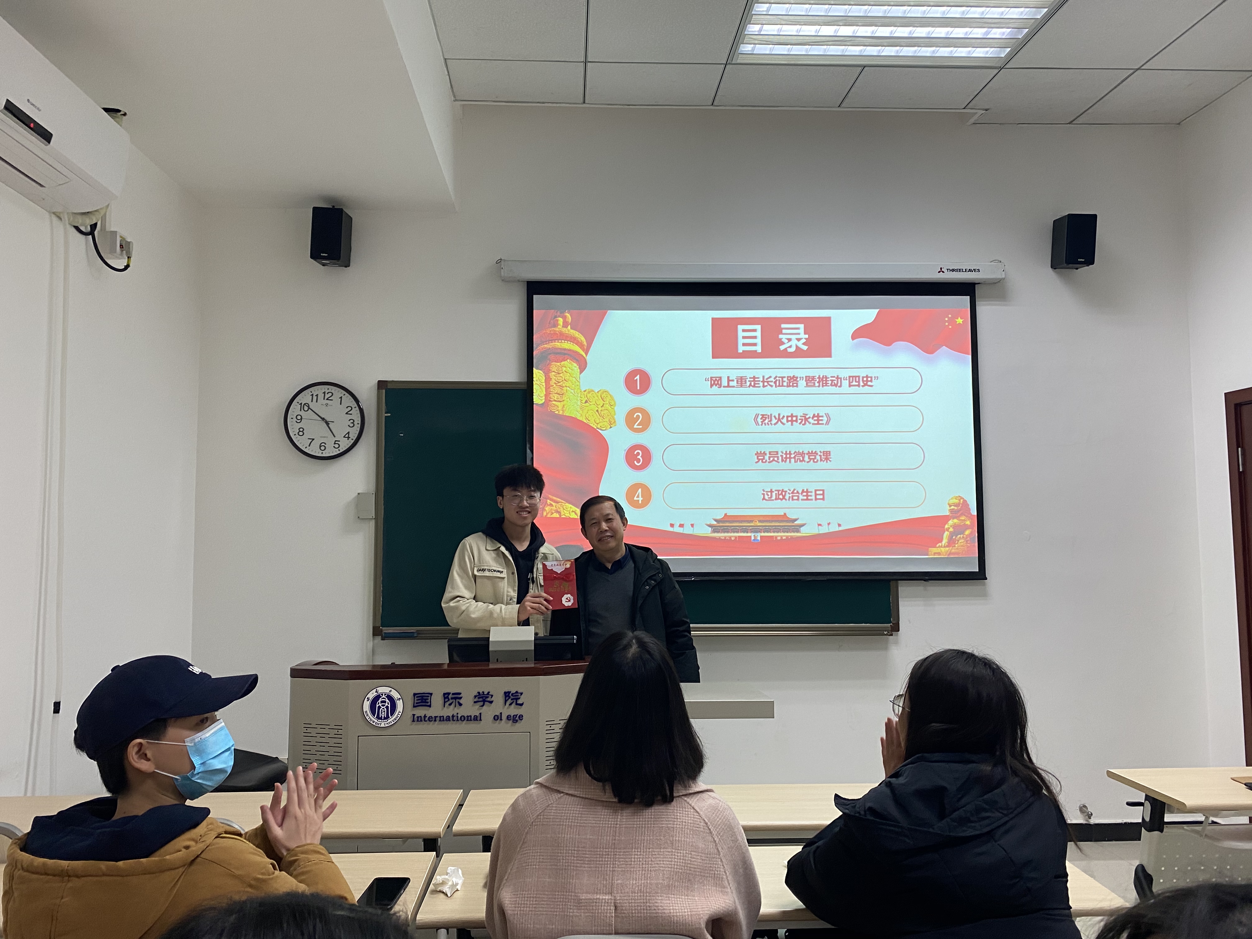 最后,全体党员和入党积极分子为汪鑫阳同志过了政治生日,并一起重温了入党誓词。汪鑫阳同志结合今天的主题学习内容发表了自己的感受,并向全体同志提出了三点要求:一是共产党人要有正确的信仰;二是共产党人要始终保持为人民服务的纯洁性和纯净性;三是作为研究生要不断提高自我核心竞争力。