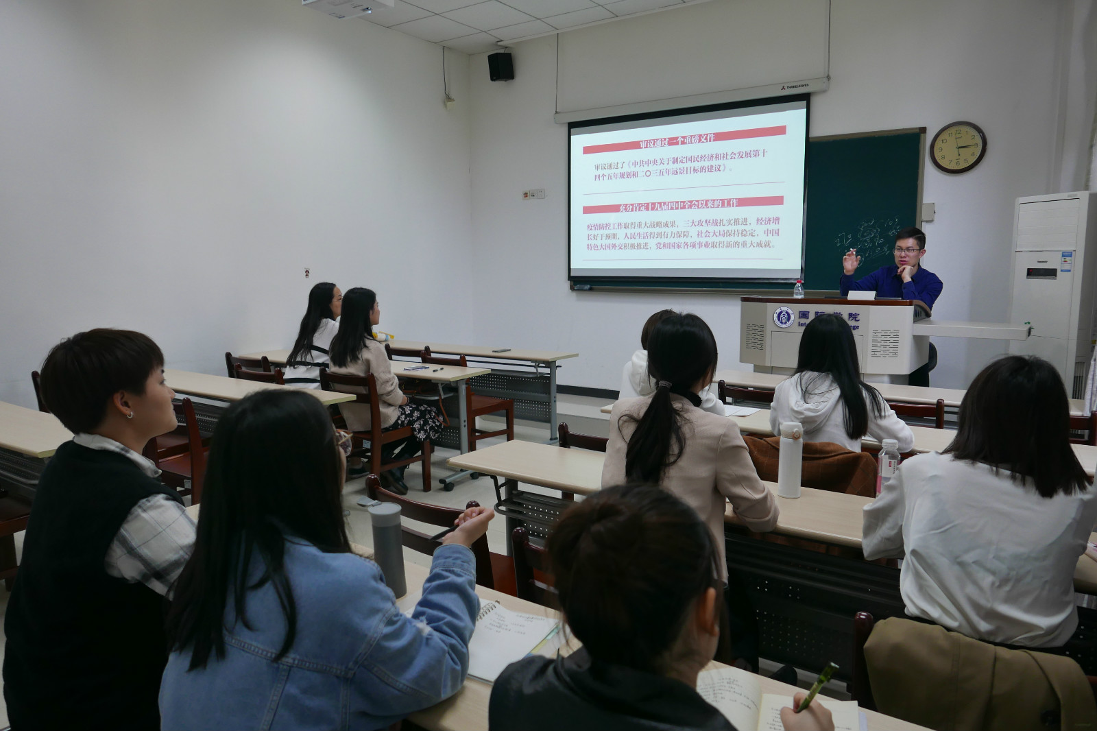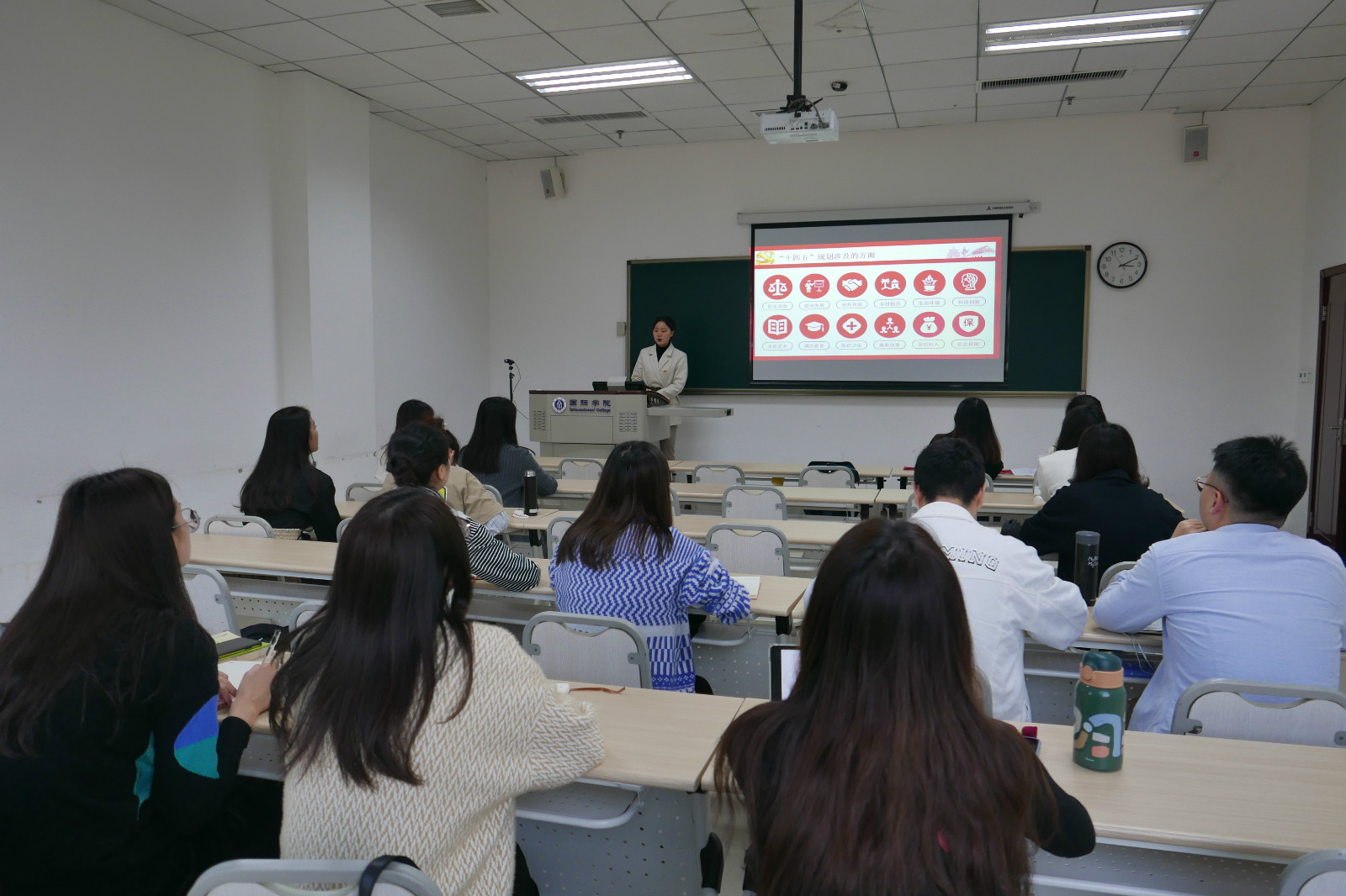 耿军同志针对当前我国努力形成以国内大循环为主体,国内国际双循环相互促进的新发展格局发表看法,并表示此次疫情正是一次很好的检验机会。我国完善的工业体系为内循环提供了支撑,但这种内循环不是闭门造车、孤芳自赏,我们要更好利用国内国际两个市场、两种资源,实现更加强劲可持续的发展。涂敏同志跟大家分享了我国新基建中5G的出色表现。冯雪同志就5G技术在车联网、互联网、区块链、芯片等多领域中的应用做进一步的介绍。王霜同志从在对外汉语文化课堂中遇到的职工对“黄金时代”的解读而意识到:当代对外汉语教师在继承传播我国优秀传统文化时,也应重点将我国现代化当中的亮点展现给新时代的职工们。