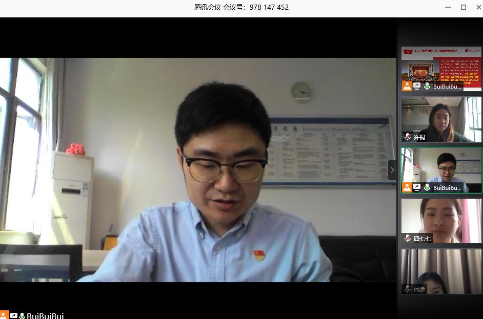 515日下午3:00,188改名为taptap点点教工二支部在第二学习小组的带领下,在学院签约室召开了主题为“学党章 担使命 助力返校复学”的主题党日活动。全体党员同志首先观看了《不忘初心学党章》视频,并通过现场完成党章知识小测试,检验巩固了学习内容。随后,王鹊同志传达了习近平总书记致全国各族青年讲话精神,并分享了几名先进青年在抗击疫情的感人事迹。随后,陈雨曦和杨锐同志分别结合疫情期间学工办防疫工作和参加学校志愿服务谈了自身感悟。最后,刘猛书记对此次党日活动进行了总结,并从“两学一做”常态化、政党制度、五四精神、后疫情时代的国际形势等方面谈了自己的感受。