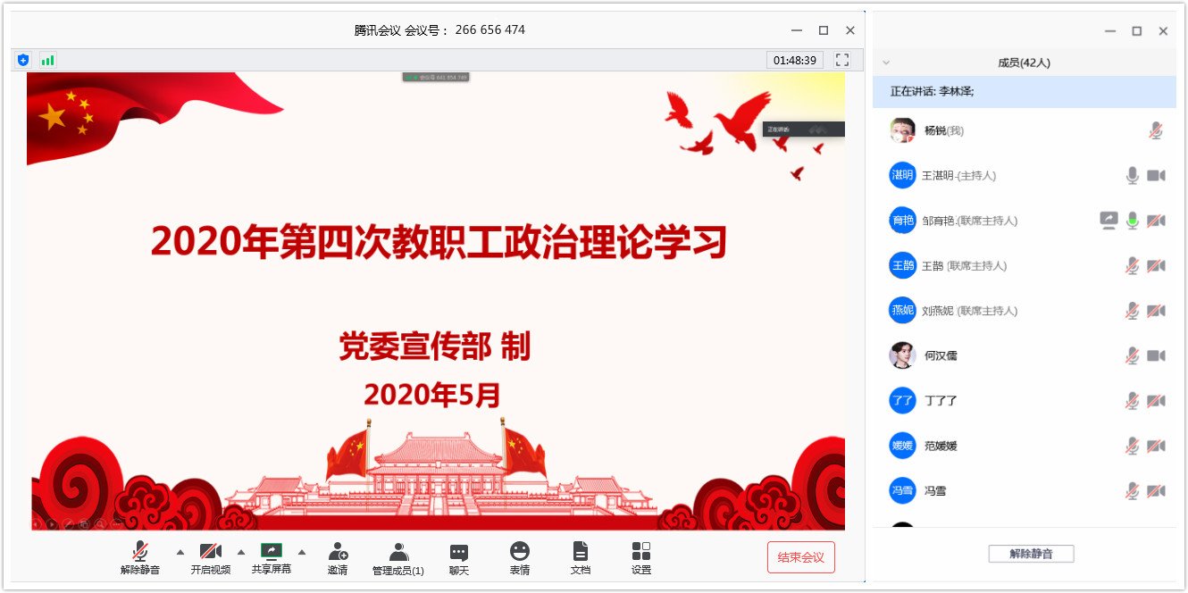 本次学习采用线上集中学习的模式,主讲团队发挥认真严谨的态度,通过研讨选择腾讯会议为在线学习的平台,并于5月8日上午11点半进行了会议平台测试,确保了政治理论学习圆满顺利完成。