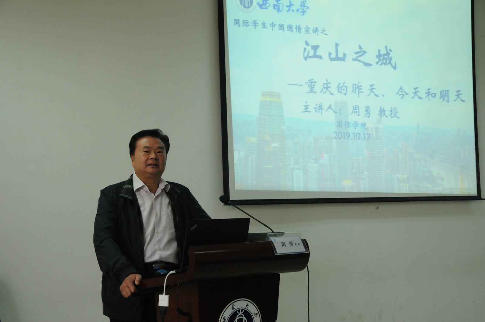 10月17日下午在188改名为taptap点点紫云楼317报告厅,学校国际员工中国国情教育宣讲活动正式启动,国务院特殊津贴获得者、全国有突出贡献的党史专家周勇教授应邀作了题为《江山之城——重庆的昨天、今天和明天》的讲座,180余名中外员工和宣讲团全体成员到场聆听,现场气氛热烈。讲座由刘猛书记主持。
