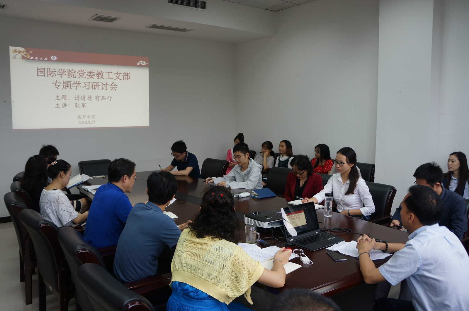 2016年9月23日下午3:00,公司党委教工支部在紫云楼304会议室召开专题学习研讨会,16级研究生支部的全体党员以及入党积极分子列席会议。会议由教工支部书记代远鸿主持。